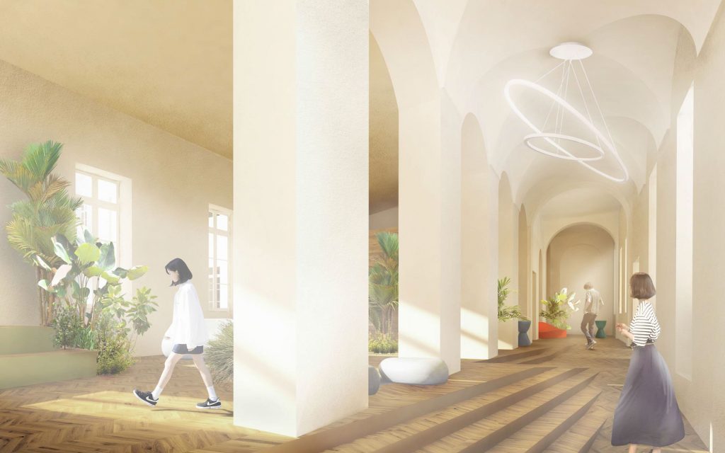 Tutti gli spazi della scuola diventeranno “ibridi”: nelle zone di passaggio come i corridoi verranno poste delle piante e le pareti ospiteranno scaffalature a disposizione degli studenti e insegnanti.
